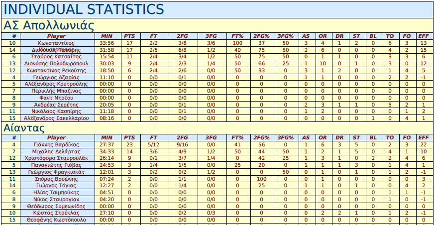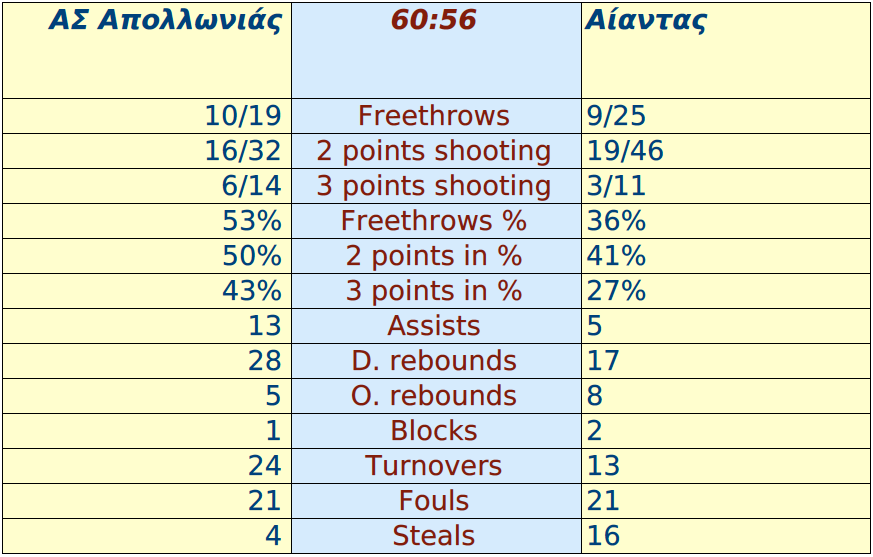 Α.Σ. Απολλωνιάς (Μπερδέσης Ανδρ): Αζαρίας Γ., Κουτρούλης Α., Κατσαϊτης Σ. 11 (1), Μπαζίνας Π., Ντρέου Φ., Σερέτης Α., Μουστρουφας Κ. 17 (3), Κασπίρης Ν., Ρεκούτης Κ. 6, Πολυδωρόπουλος Δ. 9 (1), Τάταρης Δ. 17 (1), Σακελλαρίου Α.