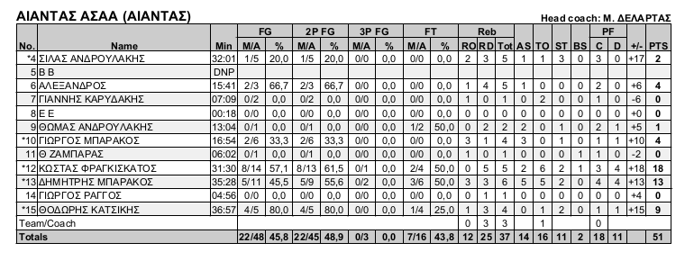 Αίαντας ΑΣΑΑ (Δελάρτας Μιχάλης): Ανδρουλάκης Σ. 2, Παπανδρεόπουλος Α. 4, Καρυδάκης Ι., Ανδρουλάκης Θ. 1, Μπαράκος Γ. 4, Ζαμπάρας Α. 11, Φραγκισκάτος Κ. 18, Μπαράκος Δ. 13, Ράγγος Γ., Κατσίκης Θ. 9.