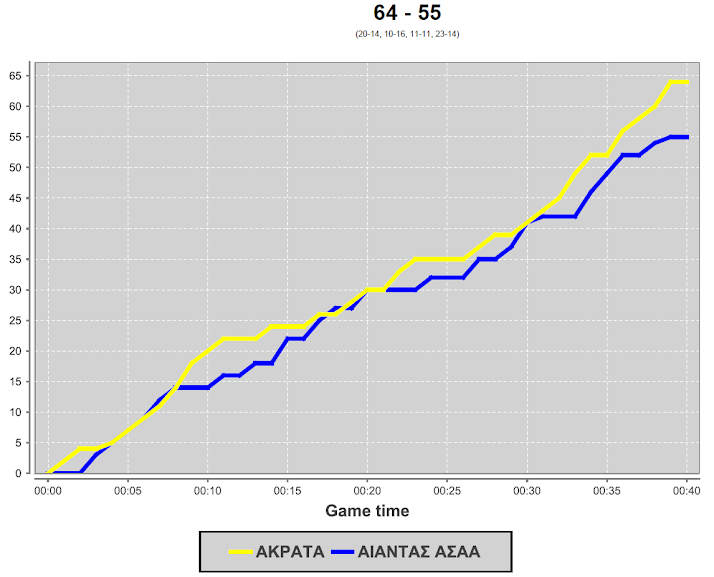 Ήττα με σκορ 64-55 επιφύλαξε η 24η στροφή του πρωταθλήματος της Α1 ΕΣΚΑΗ για τον Αίαντα ΑΣΑΑ με αντίπαλο τον ΑΠΟ Ακράτας στο Κλειστό της Ακράτας. Τα δεκάλεπτα: 20-14, 30-30(10-16), 41-41(11-11), 64-55(23-14)