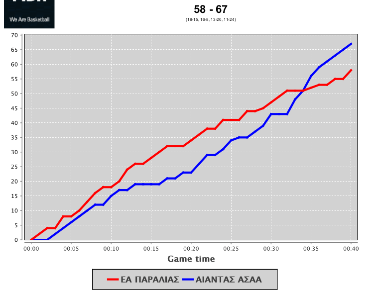Τα δεκάλεπτα: 18-15, 34-23 (16-8), 47-43 (13-20), 58-67 (11-24).