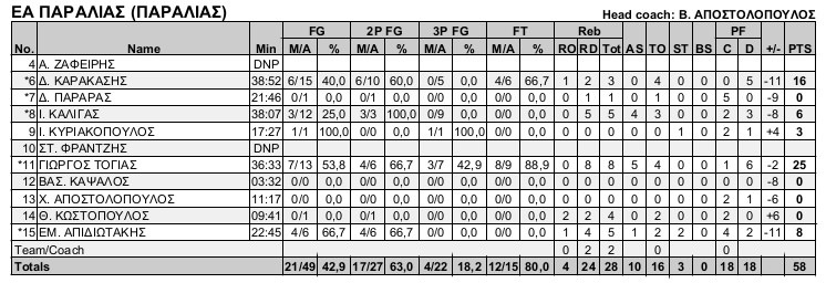 ΕΑ Παραλίας (Αναστασόπουλος Β): Ζαφείρης, Καρακάσης 16, Τσαγγαρας, Καλλιγας 6, Κυριακόπουλος 3(1), Φραντζής, Τόγιας 25(3), Καψαλος, Αποστολόπουλος, Κωστόπουλος, Αμπαδιωτάκης 8.