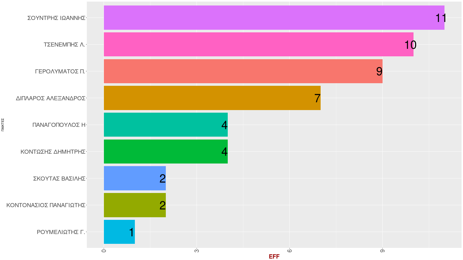 | 12 | Aσίστ (ποσοστό) | ΔΙΠΛΑΡΟΣ ΑΛΕΞΑΝΔΡΟΣ | 29.7 |
