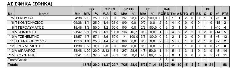 ΑΣ Σφήκα (Ντούβας): Σκουτας 8(2), Κοντονάσιος 2, Γερολυμάτος 4, Κοντωσης 5(1), Τσενεμπης 12(1), Παναγόπουλος 2, Ρουμελιώτης, Δίπλαρος 14(2), Σουντρης 11(1).