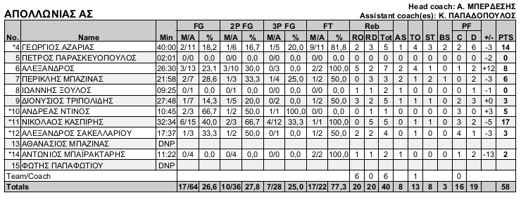 ΑΣ Απολλωνίας (Μπερδέσης): Αζαρίας 14(1), Παρασκευόπουλος, Παπανδρεόπουλος 8, Μπαζίνας Π. 6(1), Ξούλος, Τριπολίδης 3, Ντίνος 5(1), Κασπίρης 17(4), Σακελαρίου 3, Μπαζίνας Α, Μπαϊρακτάρης 2, Παπαφωτίου.