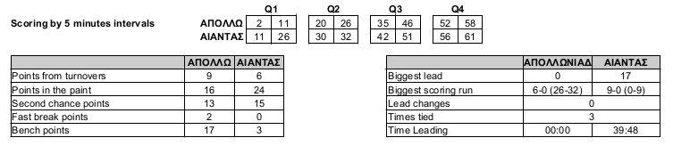 Που κρίθηκε το παιχνίδι: Η διαφορά στην αποτελεσματικότητα στην επίθεση ήταν ο κρισιμότερος παράγοντας που έκρινε το παιχνίδι υπέρ του Αίαντα αφού ο Απόλλωνας δεν κατάφερε να αποκομίσει οφέλη από τις 14 παραπάνω τελικές προσπάθειες που έκανε.