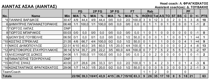 Αίαντας ΑΣΑΑ (Φραγκισκάτος): Βαρδίκος 10, Παπαμαστοράκης 2, Λάπας, Μπαράκος, Γουβελης 1, Στρέκλας 9, Δημόπουλος 13(1), Σταυρουλάκης 17(3), Δόνος 2, Τσουρούλας, Σίψας 6, Φραγκισκάτος 3.
