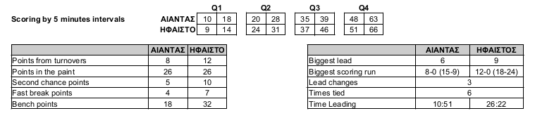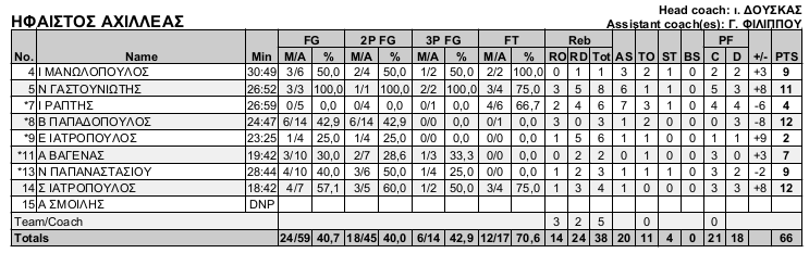 Στις λεπτομέρειες κρίθηκε το παιχνίδι της ανδρικής ομάδας με αντίπαλο τον Ήφαιστο/Αχιλλέα στο Κλειστό Δ. Τόφαλος. Το τελικό σκορ 63-66. Χρειάζεται όμως να μελετήσει κάποιος πολύ τον πίνακα της στατιστικής για να βρει απάντηση στο τι τελικά έγειρε το παιχνίδι στους φιλοξενούμενος.