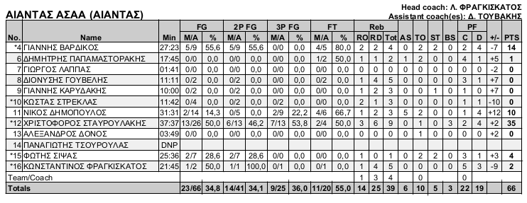 Αίαντας ΑΣΑΑ (Φραγκισκάτος Λ.): Βαρδίκος 14, Παπαμαστοράκης 1, Λάπας, Γούβελης, Καρυδάκης, Στρέκλας, Δημόπουλος 10(2), Σταυρουλάκης 35(7), Δόνος, Τσουρούλας, Σίψας 4, Φραγκισκάτος 2.