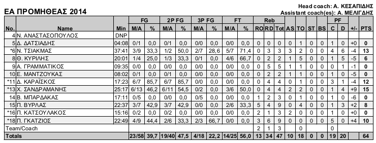 ΕΑ Προμηθέας 2014 (Κεσαπίδης): Αναστασόπουλος, Δατσιάδης, Τσιακμάς 13(2), Κυριλής 6(1), Γραμματικός, Μαντζούκας, Καραϊσκος 12, Σανδραμάνης 15, Μπαρδάκας, Βύρλας 8, Κατσουλάκος, Γκάτζιος 10(2).