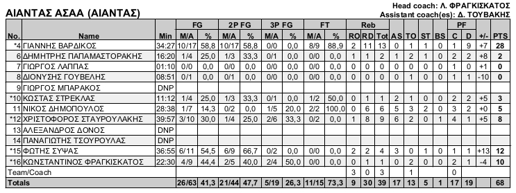 Αίαντας ΑΣΑΑ (Φραγκισκάτος Λ.): Βαρδίκος 26, Φραγκισκάτος 10(2), Παπαμαστοράκης 2, Λάππας, Γουβελης, Μπαράκος, Στρέκλας 3, Δημόπουλος 5(1), Σταυρουλάκης 10(2), Δόνος, Τσουρούλας, Σίψας 12.
