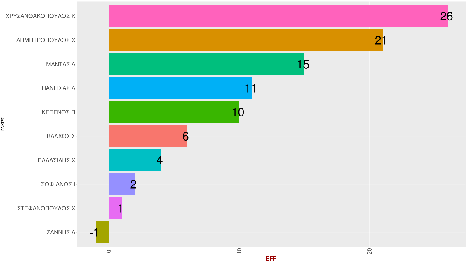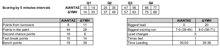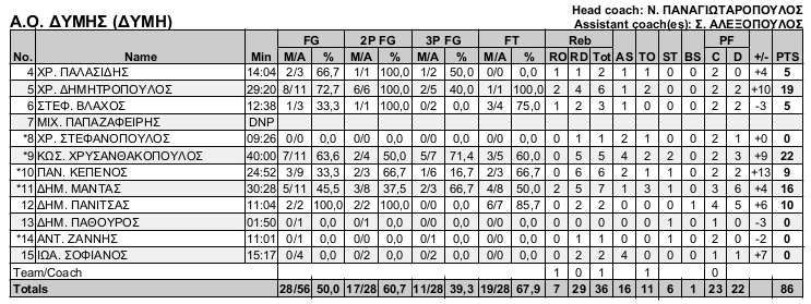 ΑΟ Δύμης (Παναγιωταρόπουλος): Παλασιδης 5(1), Δημητρόπουλος 19(2), Βλάχος 5, Παπαζαφείρης, Στεφανόπουλος, Χρυσανθακόπουλος 22(5), Κεπενος 9(1), Μαντας 16(2), Πανίτσας 10, Παθουρος, Ζαννης, Σοφιανός.