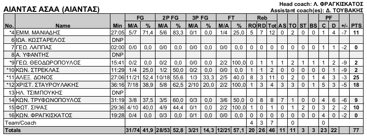 Αίαντας ΑΣΑΑ (Φραγκισκάτος): Μανιαδης 11, Κωσταρελος, Λάπας, Υφαντής, Θεοδωρόπουλς 2, Στρέκλας 2, Δόνος 25(1), Σταυρουλάκης 18(2), Τσιμπούκης, Τρυφωνόπουλος 9, Σϊψας 10, Φραγκισκάτος.