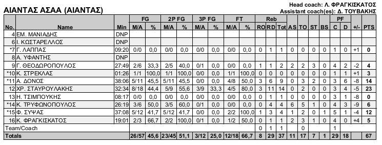 Αίαντας ΑΣΑΑ (Φραγκισκάτος Λ): Μανιαδης, Φραγκισκάτος 7, Κωσταρελλος, Λαππας, Υφαντής, Θεοδωροπουλος 4, Στρεκλας 3, Δονος 14, Σταυρουλακης 21(3), Τσιμπουκης, Τρύφωνόπουλος 6, Συψας 12.