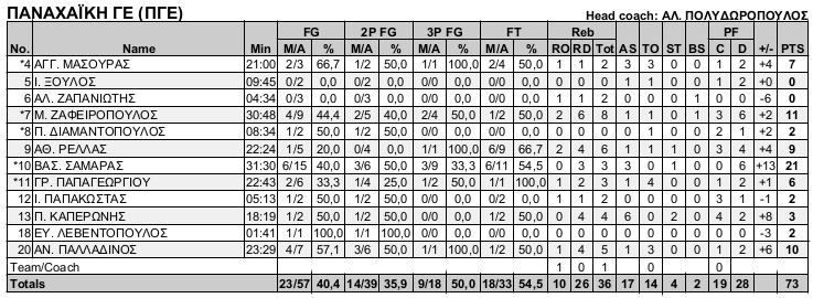 Παναχαϊκή (Πολυδωρόπουλος): Μασουρας 7(1), Ξουλος, Ζαπανιωτης, Ζαφειροπουλος 12(2), Διαμαντοπουλος 2, Ρελλας 9(1), Σαμαράς 20(3), Παπαγεωργίου 6(1), Παπακώστας 2, Καπερωνης 3, Λεβεντοπουλος 2, Παλλαδινος 10(1).