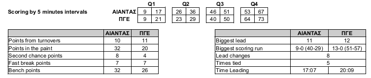 Τα δεκάλεπτα: 17-21, 36-29 (19-8), 51-50 (15-21), 67-73 (16-23).