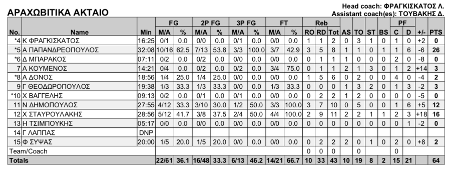 Πολύ καλή εμφάνιση και 22 πόντους από τον Παπανδρεόπουλο που ειδικά στο δύσκολο πρώτο ημίχρονο συνέβαλε τα μέγιστα επιθετικά με αποτέλεσμα να συγκρατηθεί η διαφορά χαμηλά. Πολύ ψηλά και ο Σταυρουλάκης που έβαλε τη σφραγίδα του στην ανατροπή του σκορ.