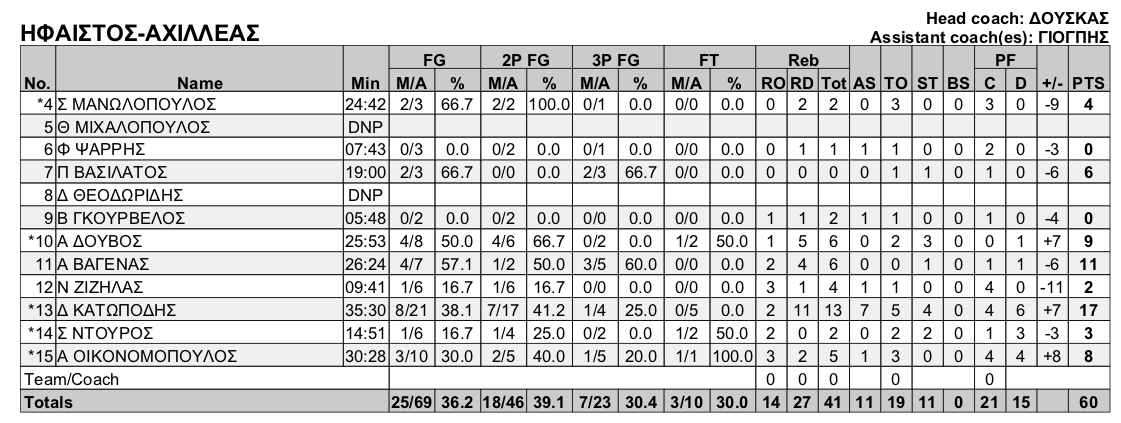 Ήφαιστος/Αχιλλέας (Δούσκας): Μανωλόπουλος 4, Μιχαλόπουλος, Ψαρρης, Βασιλάτος 6(2), Θεοδωρίδης, Γκουρβελος, Δουβος 9, Βαγενάς 11(3), Ζιζηλας 2, Κατωπόδης 17(1), Ντούρος 3, Οικονομόπουλος 8(1).