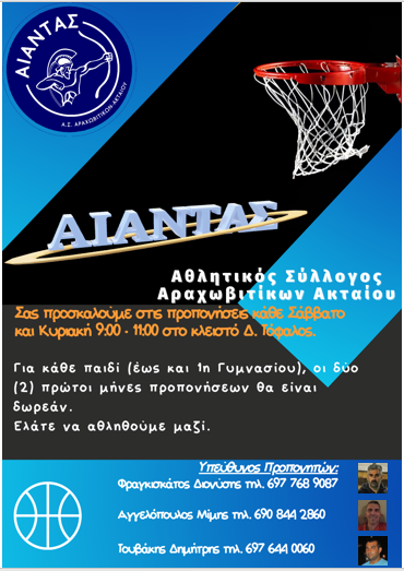Η ακαδημία του Αθλητικού Συλλόγου Αραχωβιτίκων Ακταίου ξεκινάει τις προπονήσεις της το Σάββατο 11 Σεπτεμβρίου στις 9.00 στο Κλειστό Δ. Τόφαλος.